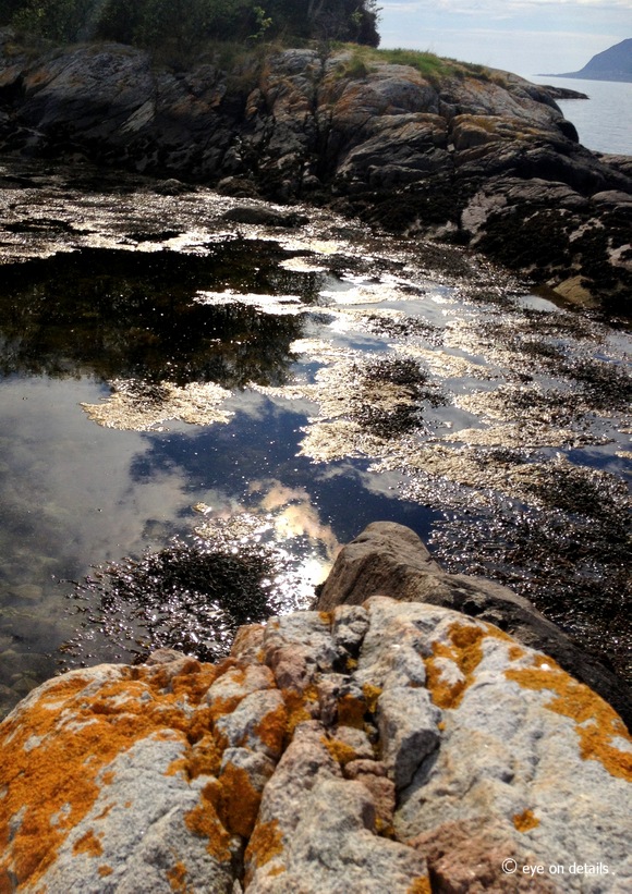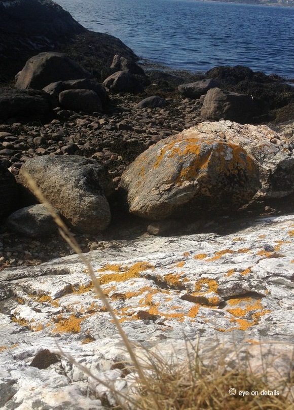 Blåfargene fra sjø og himmel er nydelig sammen med den guloransje laven på steinene i fjøra!